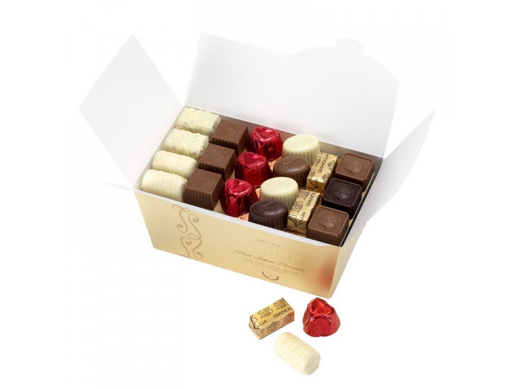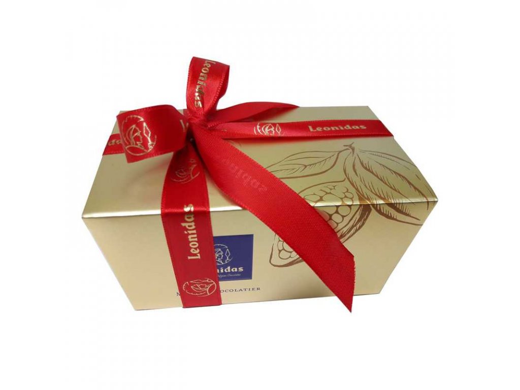Zlatá papírová krabička, bonboniéra naplněná mixem belgických pralinek Leonidas z belgické čokolády.
