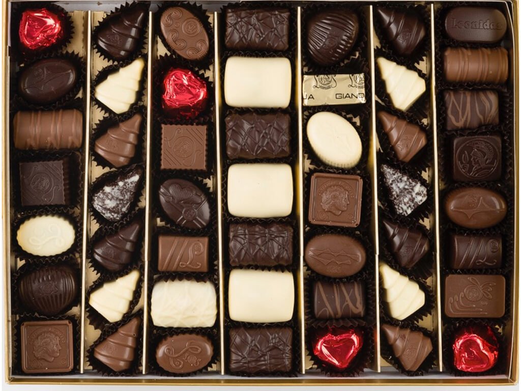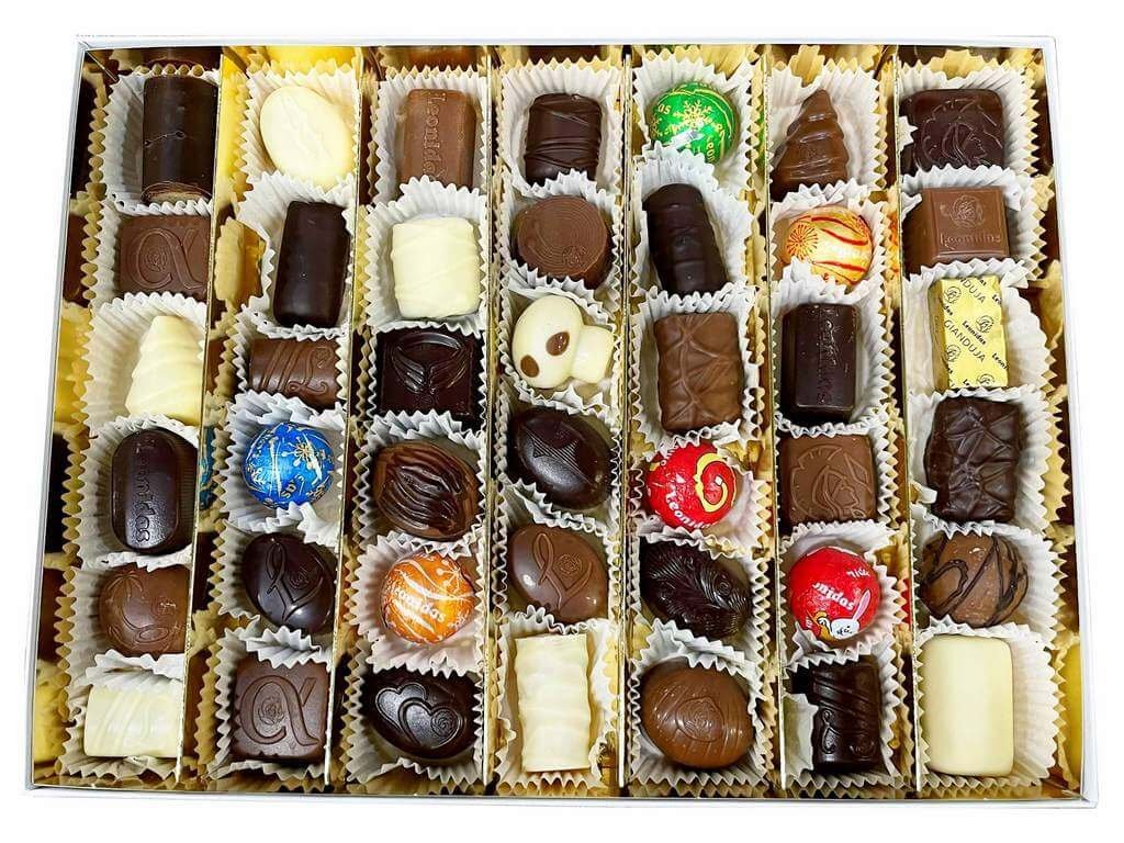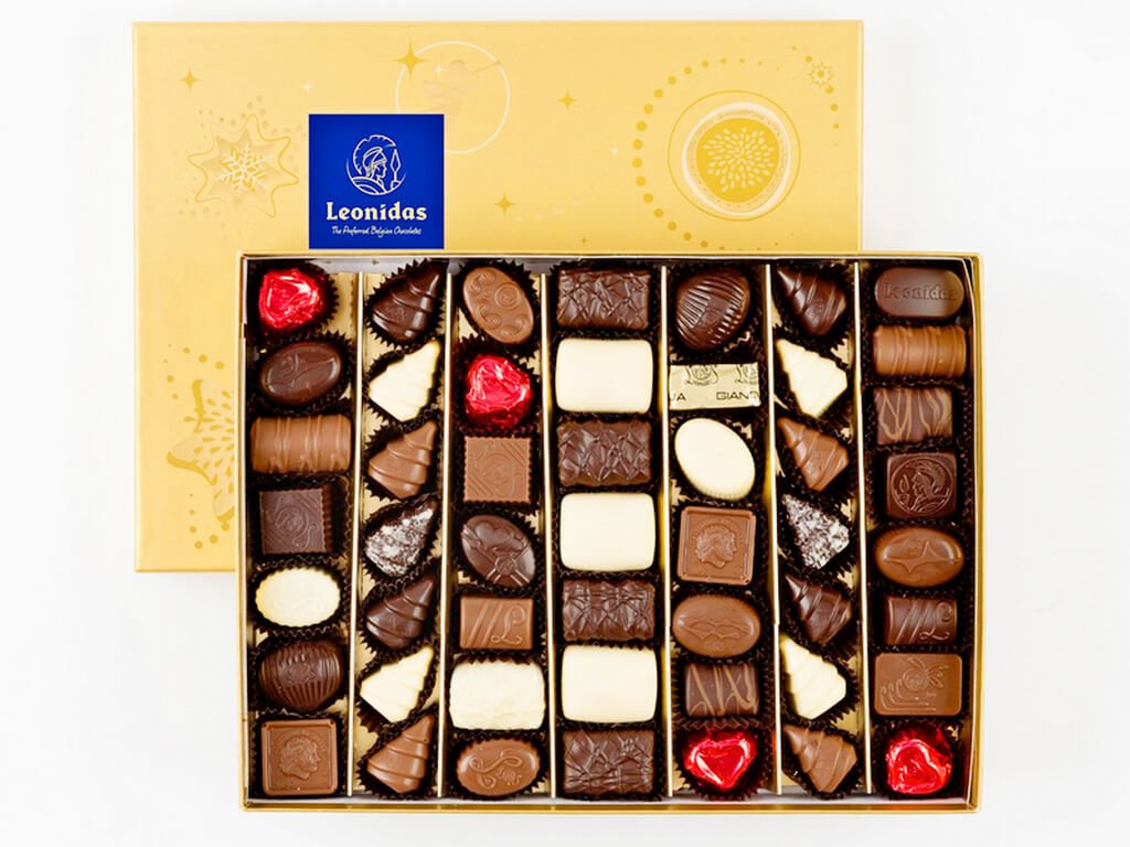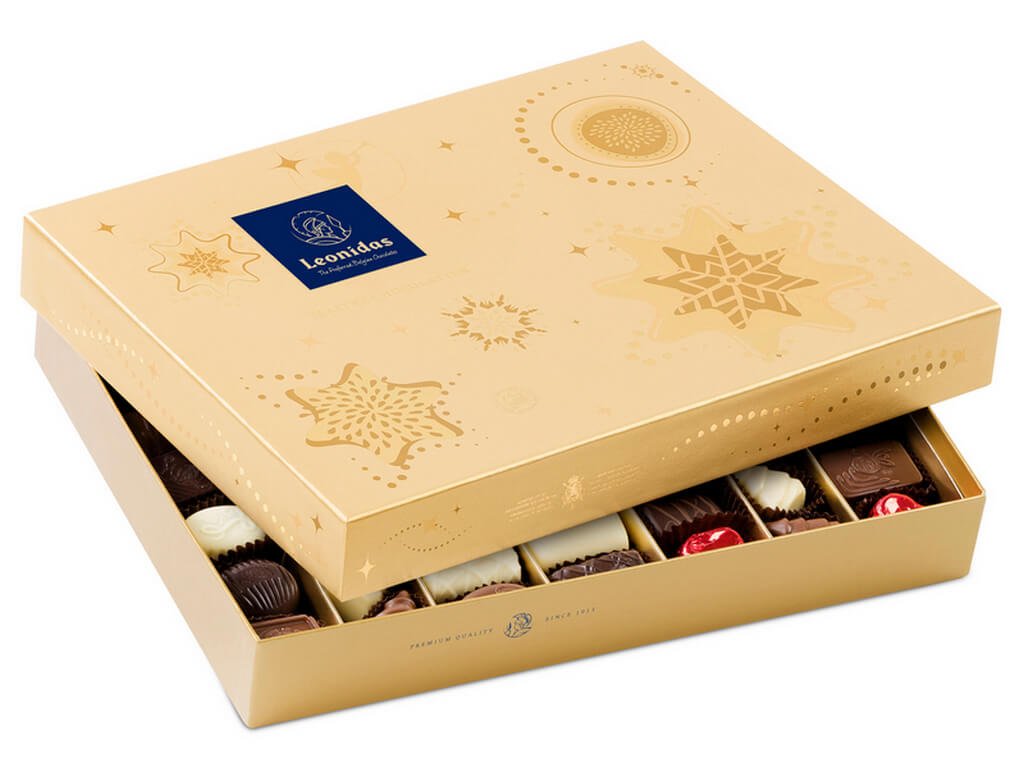 Luxusní zlatá vánoční bonboniéra naplněná mixem cca 42ks tradičních pralinek Leonidas.